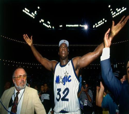 奧尼爾當年被魔術選為1992年狀元秀。他在魔術4年,4次入選全明星,3次入選最佳陣容(2次三陣,1次二陣)。他在1994-95賽季拿下得分王(29.3分),還有11.4個籃板2.7次助攻2.4次蓋帽,并攜手便士哈達威一起,東部半決賽掀翻剛復出的喬丹領軍的公牛,殺入總決賽。這是魔術隊史上第一次總決賽之旅。可惜魔術被奧拉朱旺領軍的火箭剃了光頭。