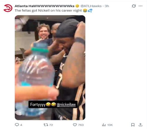 賽后老鷹全隊在更衣室朝著亞歷山大-沃克瘋狂的澆水慶祝,因為沃克才是這場比賽贏球的第一功臣,他打出職業生涯之夜。