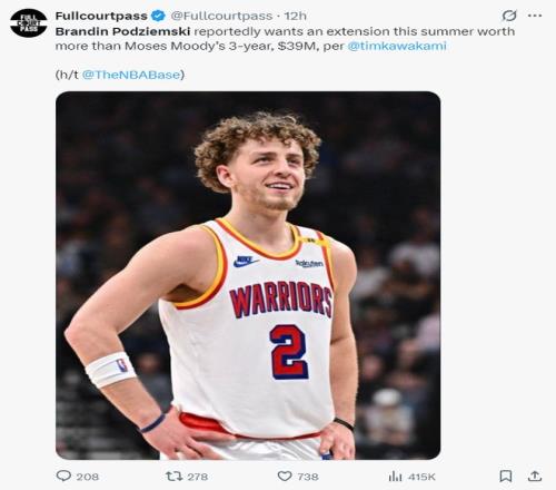 賽前根據勇士記者蒂姆川上的報道,波杰姆斯基預計在今夏尋求一份三年超過3900萬的續約合同,他想要的比穆迪三年3900萬要多得多,勇士方面已經表達不可能給他像普爾那樣4年1.23億的巨額合同,所以他索要的合同是三年4000萬以上。