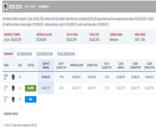 28歲的梅爾頓去年夏天與勇士簽下的合同是兩年653萬,本賽季300萬,下賽季345萬,他的性價比完爆波杰。