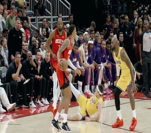 湖人利用杜蘭特休息的機會,不斷利用沖擊打成二次進攻,烏度卡對于大家的注意力感到不滿。隨后卡佩拉、伊森、賈巴里史密斯不斷在內線拼到二次籃板,謝潑德連續搶斷東契奇、詹姆斯,杜蘭特強勢突破連得4分,半場比賽結束,火箭反超了6分。
