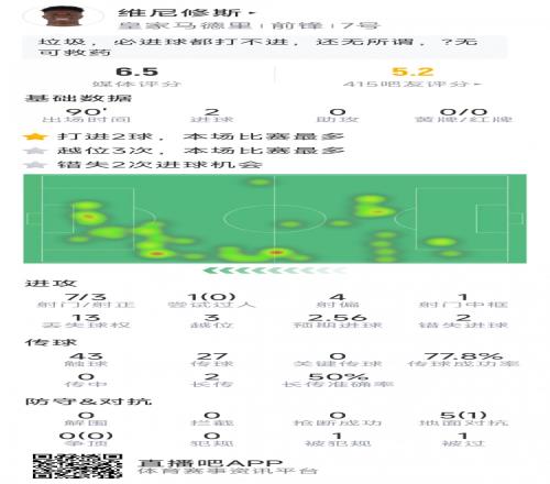 維尼修斯本場數據:梅開二度,7射3正,1次中框,2次錯失良機