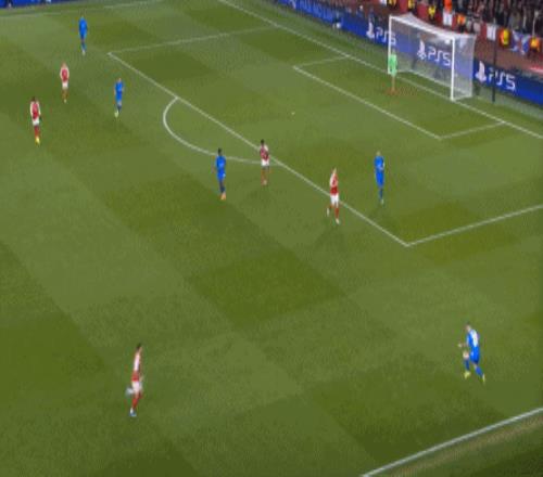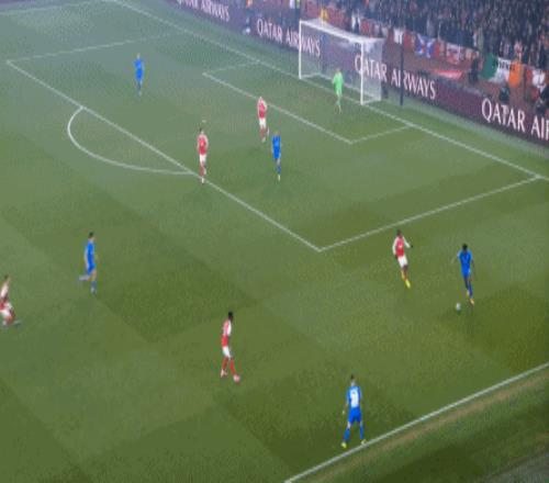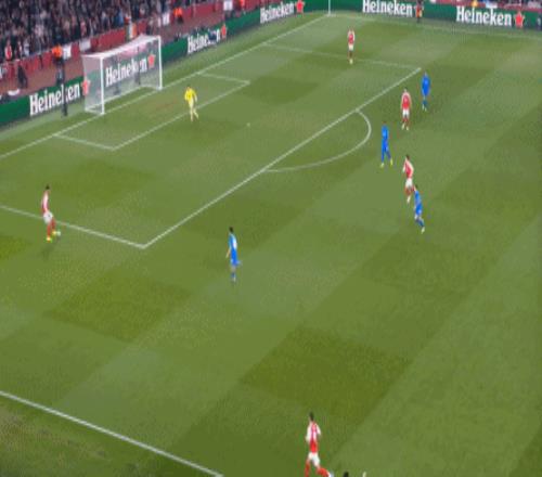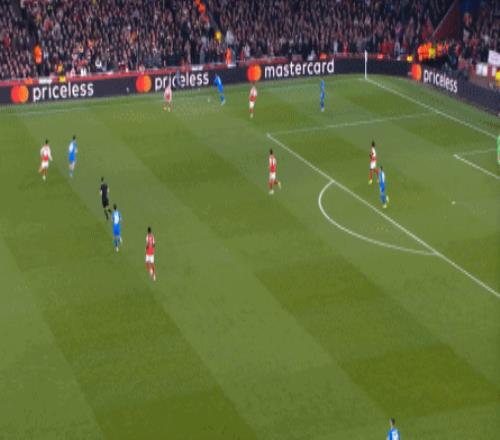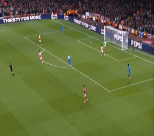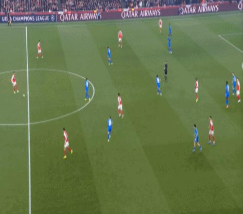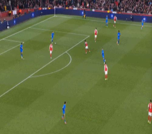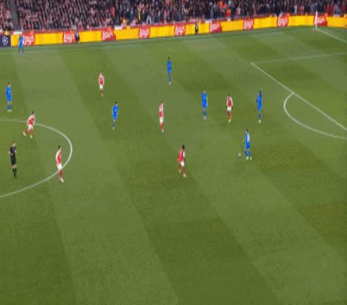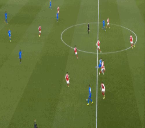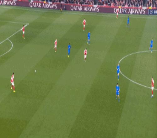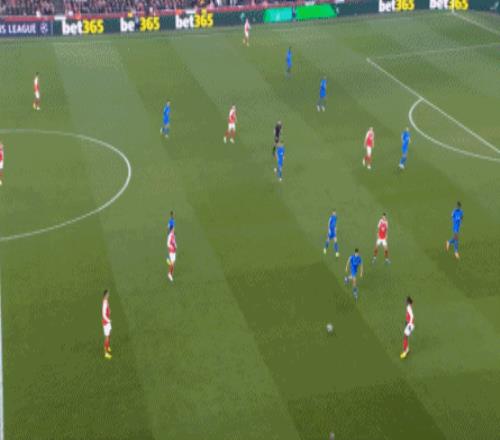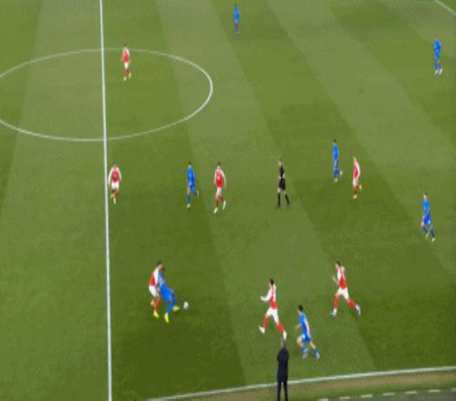 但是,隨著隊形的向前,三線的距離就會變得難以保持,這是面對比分落后的球隊最難以處理的問題,也是比分領先的球隊需要把握的機會,所以到了下半場,阿森納依然可以通過長傳球打進兩線之間,從而銜接射門: