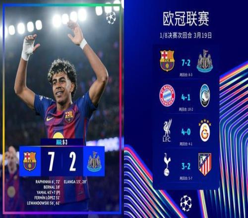 全場比賽結(jié)束,巴薩主場7-2狂勝紐卡踢出大比分慘案,兩回合總比分8-3挺進(jìn)本賽季歐冠8強(qiáng),拉菲尼亞2球2助當(dāng)選本場MVP!