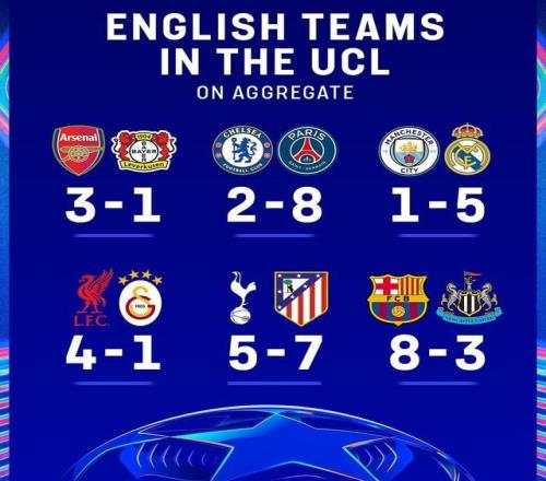 本賽季歐冠1/8決賽已全部結(jié)束,英超6隊(duì)僅剩阿森納和利物浦順利晉級。