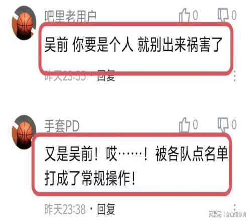 吳前關(guān)鍵時刻的兩個低級錯誤,賽后也是被網(wǎng)友紛紛吐槽。“吳前一個無腦犯規(guī),一個發(fā)球失誤,送走比賽,不想打就回去好好繼承家產(chǎn)吧,受不了。”;“吳前還打個鬼,還不如好好培養(yǎng)李月洲。”;“吳前 你,就別出來禍害了”;“又是吳前!哎……!被各隊(duì)點(diǎn)名單打成了常規(guī)操作!”;“吳全,趕緊退役吧!”……