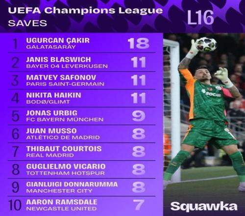 本賽季歐冠八分之一決賽兩回合撲救總數榜: