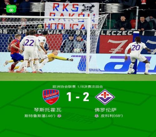 北京時間3月20日歐洲協會聯賽 1/8決賽次回合,琴斯托霍瓦對陣佛羅倫薩。上半場斯特魯斯基首開記錄下半場恩杜爾射門皮球碰到皮科利折射入網,補時階段龐格拉契奇超遠距離破門鎖定勝局。最終比分琴斯托霍瓦 1-2 佛羅倫薩。兩回合總比分琴斯托霍瓦2-4佛羅倫薩。