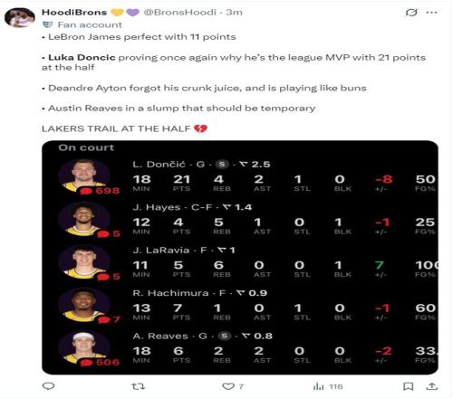 第二節的東契奇比首節還準,單節6分鐘里7中4,三分2中1,拿到9分2籃板1搶斷,東契奇的爆炸就是湖人將15分縮小到個位數的關鍵,東契奇半場18分鐘拿到21分4籃板2助攻1搶斷,命中率50%。
