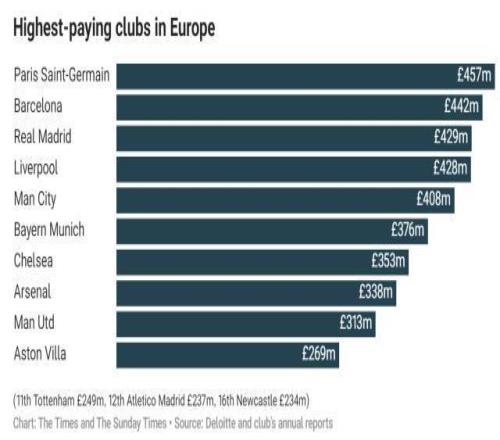 英超整體經(jīng)濟(jì)體量舉世第一,轉(zhuǎn)會(huì)總開銷也往往抵上其他四大聯(lián)賽之和,這都是事實(shí)。但必須指出,在最頂尖豪門的領(lǐng)域,英超不僅競技實(shí)力對(duì)比“皇薩仁黎”往往處于下風(fēng),就比錢,英超豪門經(jīng)常也是相對(duì)“貧窮”的那個(gè)。