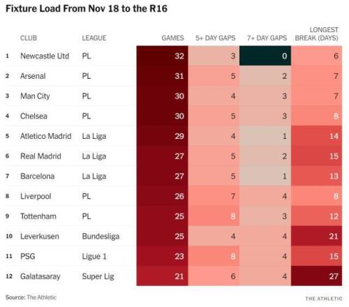 英超球隊(duì)沒有冬休,比賽數(shù)量更多,是事實(shí)。競技網(wǎng)一周前的數(shù)據(jù)顯示,本季五大聯(lián)賽,比賽數(shù)量前4名,被紐卡斯?fàn)柭?lián)、阿森納、曼城、切爾西這4支英超球隊(duì)包攬。本周一組新數(shù)據(jù),則揭示了從11月國際比賽周到歐冠16強(qiáng)之間的更鮮明對(duì)比。上述英超4隊(duì)最多打了32場比賽,皇薩則只有27場。