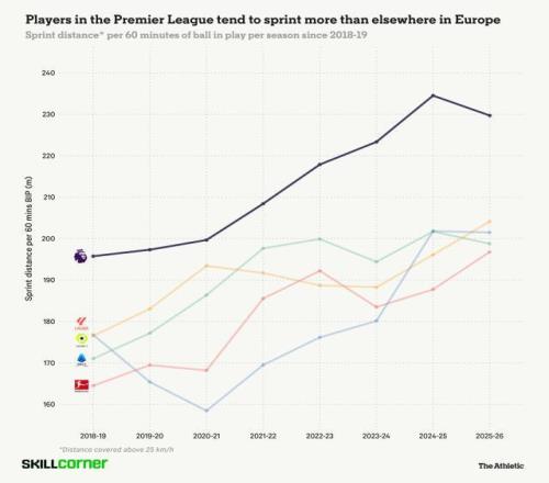 還有比賽風(fēng)格。比如,英超球隊(duì)每60分鐘活球時(shí)間的沖刺次數(shù)為230次,其余四大聯(lián)賽都在200次上下。這些因素不可能一點(diǎn)影響也沒有。
