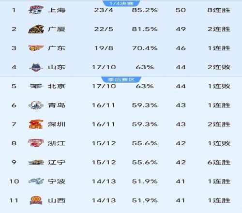 再看第六與第七名:青島國信水產和深圳馬可波羅戰績同為16勝11負,積分同積43分,分列第六、第七。這意味著,從第四名山東到第七名深圳,四支球隊之間最大分差僅為1分——相當于一場比賽的凈勝分,就足以改寫全部排序邏輯。