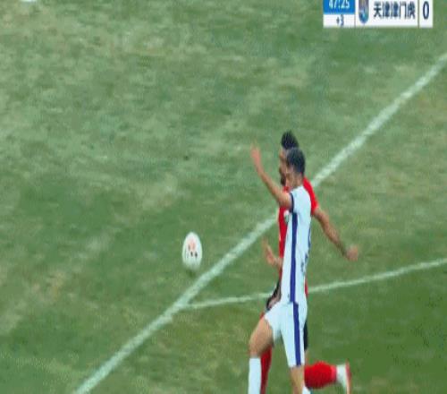 半場補時第3分鐘,基萊斯禁區內挑傳擊中費利佩手臂,津門虎投訴對手手球,但主裁判拒絕判罰點球。