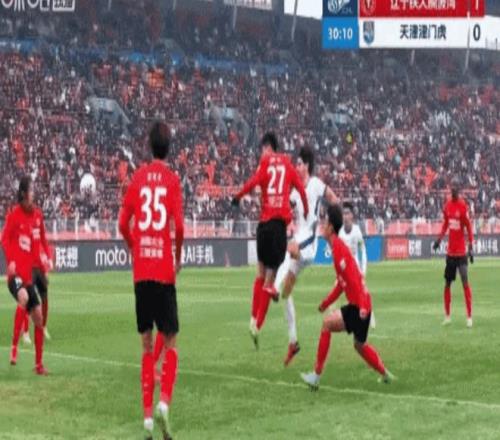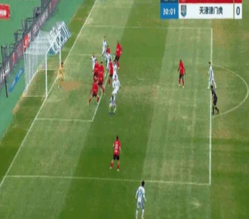 丟球后的津門虎急于扳平比分,第30分鐘他們終于找到機會,左路定位球吊入禁區(qū)制造亂戰(zhàn),王獻鈞的頭球攻門被韓镕澤神勇?lián)醭觯袪柮犯涎a射,又被遼寧鐵人的后衛(wèi)用身體擋出,兩次近在咫尺的射門都沒能轉(zhuǎn)化為進球,津門虎的運氣屬實差了點。