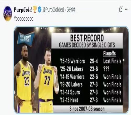 另一項數(shù)據(jù)更嚇人:分差個位數(shù)的比賽,湖人23勝6負,勝率79.3%。自2007-08賽季以來,這個勝率排在歷史第二,僅次于2015-16賽季的勇士。