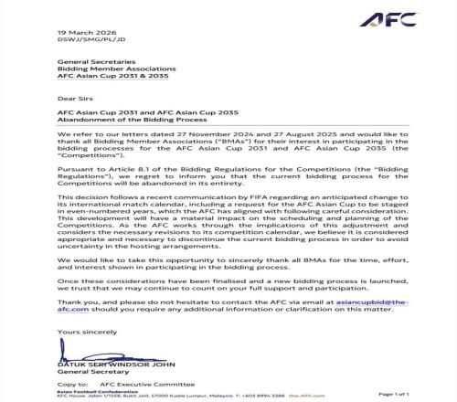 此變化將對(duì)賽事的日程安排和規(guī)劃產(chǎn)生重大影響。鑒于亞足聯(lián)正在梳理這一調(diào)整的影響,并考慮對(duì)賽事日歷進(jìn)行必要修訂,我們認(rèn)為:為避免辦賽安排的不確定性,終止當(dāng)前申辦流程是恰當(dāng)且必要的。
