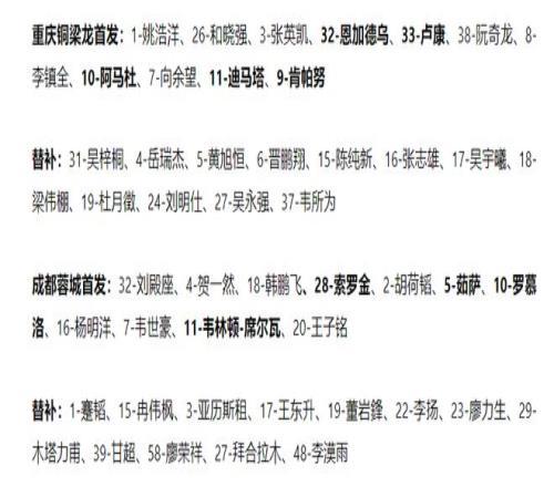 中超前兩輪,重慶銅梁龍作為升班馬,取得1勝1平積4分,暫列積分榜第2名,而客場作戰的成都蓉城,則是兩戰全勝積6分,排名積分榜第1名,值得一提的是,兩隊曾在足協杯交手,當時身在中乙的重慶銅梁龍依靠點球大戰完成以下克上。