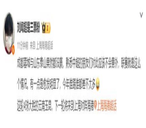 海港跟隊記者劉聞超則是表示,成都蓉城與山東泰山果然沒贏,熟悉中超的朋友們對此應該不會意外,聯賽就是這么個情況,該記者同時指出,本賽季中超球隊實力都非常接近了,誰踢誰都差不多了……