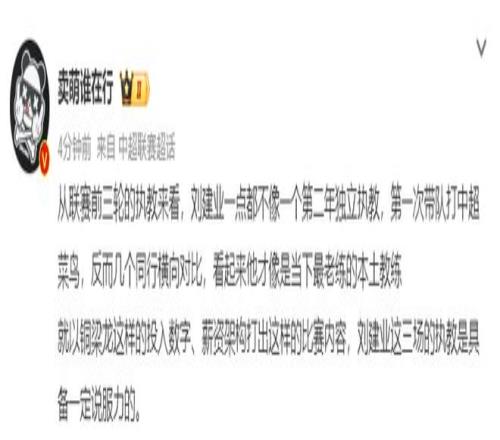 媒體人“賣萌誰在行”在個人社媒寫道:“從聯賽前三輪的執教來看,劉建業一點都不像一個第二年獨立執教,第一次帶隊打中超菜鳥,反而幾個同行橫向對比,看起來他才像是當下最老練的本土教練……”