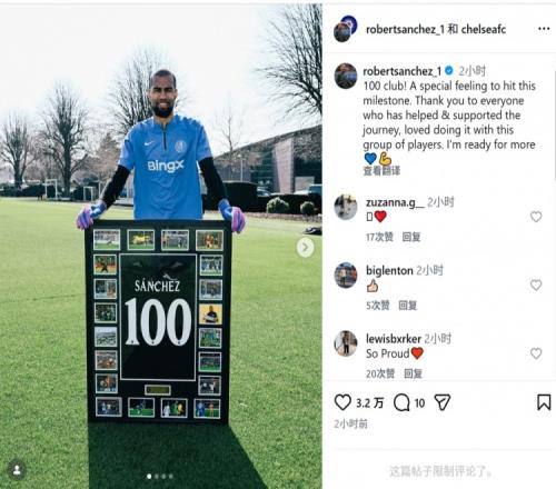 體育播報3月20日宣 切爾西門將桑切斯更新社媒動態,慶祝達成藍軍生涯100場比賽里程碑。