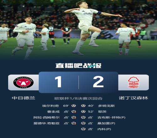 諾丁漢森林點球大戰3-0中日德蘭晉級八強,將對陣波爾圖和斯圖加特之間的勝者。