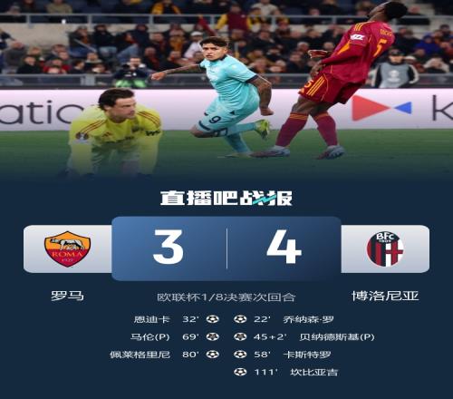 羅馬3-4博洛尼亞總比分4-5無緣歐聯八強,博洛尼亞八強將戰維拉。