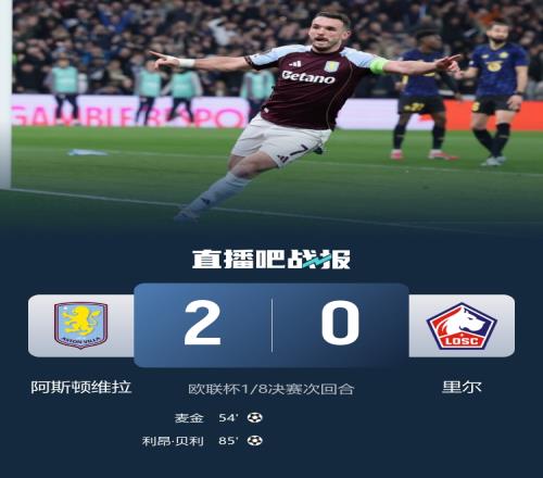 維拉主場2-0戰勝里爾,總比分3-0淘汰對手晉級歐聯八強。
