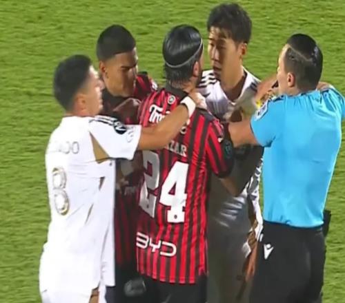美冠杯1/8決賽,洛杉磯FC總比分3-2戰(zhàn)勝阿拉胡埃倫斯晉級(jí)。第50分鐘,孫興慜被阿拉胡埃倫斯球員薩拉扎滑鏟,起身后孫興慜非常不滿。