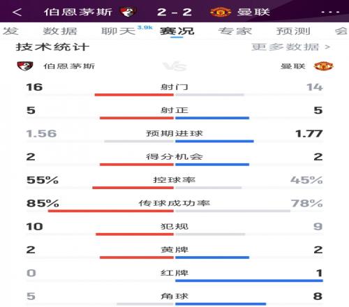 體育播報3月21日宣 在本輪英超,曼聯2-2戰平伯恩茅斯,以下為雙方全場數據對比: