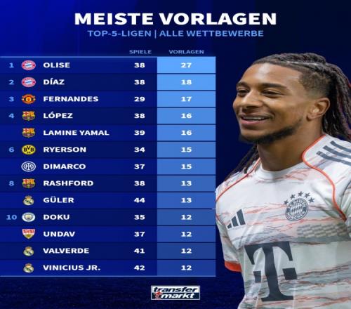 本賽季五大聯賽球員助攻榜:奧利塞27助斷層居首,迪亞斯18助次席
