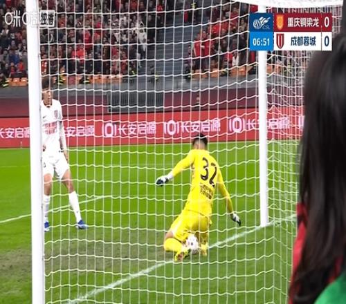 比賽第6分鐘,向余望搶點打門,劉殿座在門線上將球控制住。