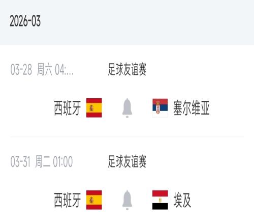 西班牙本月將在國內進行兩場熱身賽,分別是北京時間3月28日凌晨4點對陣塞爾維亞、3月31日凌晨1點對陣埃及。