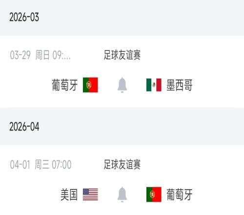 葡萄牙本月底將前往墨西哥和美國進行兩場熱身賽,分別是北京時間3月29日上午9點對陣墨西哥、4月1日上午7點對陣美國。