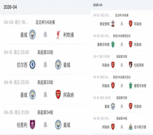 目前英超還剩7輪,阿森納在4月需要在15天內參加5場各項賽事。首先是他們需在當地時間4月4日客場對陣南安普頓進行足總杯1/4淘汰賽,3天后遠赴里斯本進行與葡萄牙體育的歐冠1/4淘汰賽。11日回到英超主場迎戰伯恩茅斯,4天后主場與葡體迎來歐冠1/4淘汰賽次回合較量,4月19日則在客場與曼城展開一場決定英超冠軍歸屬的對決。