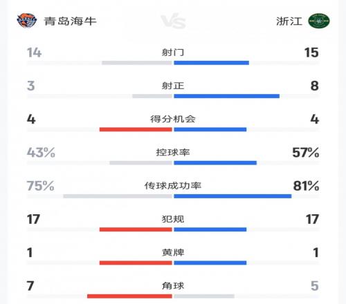 體育播報3月20日宣 本輪中超,青島海牛1-4浙江隊。雙方全場重點數據對比如下↓(主隊海牛在前)