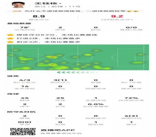 雙響建功!王鈺棟數(shù)據(jù):4射3正2進(jìn)球1關(guān)鍵傳球,評分8.9全場最高