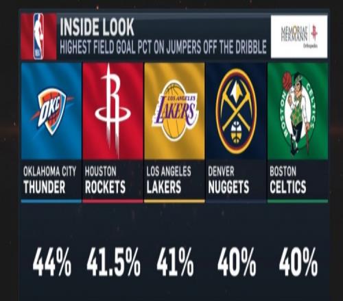 本賽季運球后跳投命中率前五:雷霆44%最高火箭湖人掘金綠軍上榜