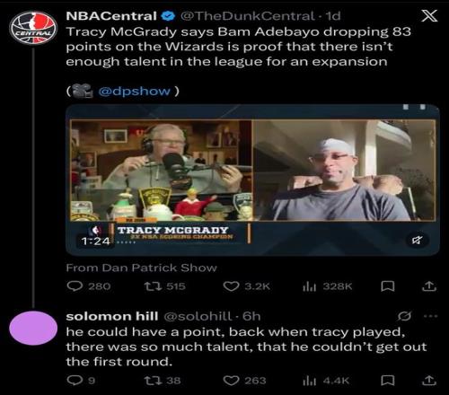 所羅門-希爾在美媒“NBA Central”的這條新聞下面回復道:“麥迪這話或許有道理。想當年他打NBA的時候,聯盟到處都是天賦異稟的家伙,他都沖不出首輪。”