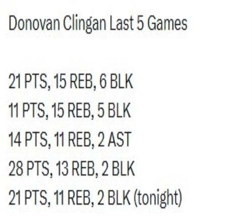 過(guò)去五場(chǎng)比賽,克林根全部拿下兩雙,其中三場(chǎng)20+10。