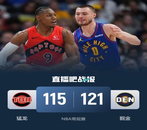 比賽開始,猛龍反客為主打出11-2的開局,掘金輪番沖擊內線頻頻得手努力追趕,小哈達威連中三分,次節猛龍命中率下降,掘金內外開花迅速反超,此后雙方展開拉鋸戰,比分交替領先,布勞恩三分穿針,半場戰罷掘金57-53領先猛龍。易邊再戰,掘金突然斷電,猛龍趁勢打出14-5的攻擊波取得兩位數優勢,約基奇和布魯斯·布朗先后命中三分止血,末節猛龍進攻啞火,小哈達威連中三分幫助掘金反超,猛龍內外開花頑強咬住,關鍵時刻珀爾特爾2+1扳平比分,掘金連投帶罰強勢回應,珀爾特爾關鍵兩罰全丟。最終,掘金121-115力擒猛龍,主場過關。
