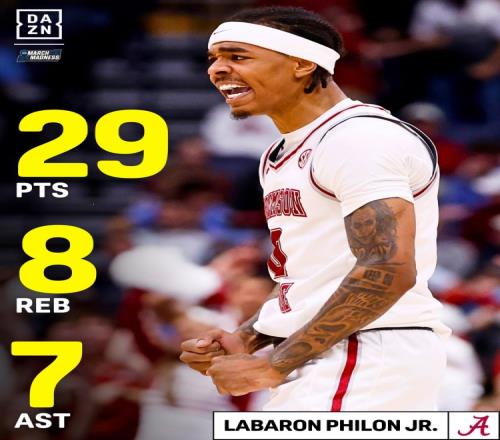 本場比賽,阿拉巴馬大學后衛小拉巴隆·菲隆全場出戰36分鐘,18投10中,三分7投3中,罰球7罰6中,得到29分8籃板7助攻3搶斷。