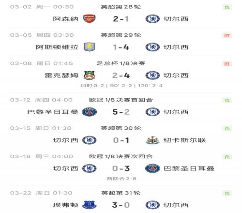 二月份,切爾西共出戰(zhàn)6場(chǎng),取得3勝2平1負(fù)的戰(zhàn)績(jī)。三月份,切爾西各賽事2勝5負(fù),歐冠2-5、0-3慘敗巴黎出局。
