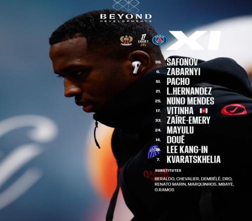 39-薩福諾夫、6-扎巴爾尼、51-帕喬、21-盧卡斯、25-努諾·門德斯、17-維蒂尼亞、33-扎伊爾·埃梅里、24-馬尤盧、14-杜埃、19-李剛仁、7-克瓦拉茨赫利亞