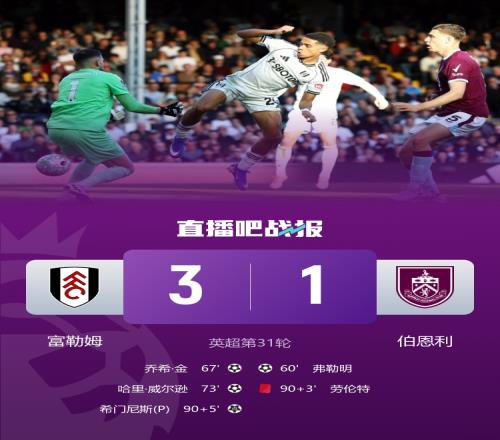 下半場(chǎng)補(bǔ)時(shí)6分鐘,富勒姆3-1伯恩利。
