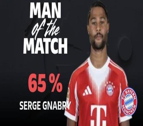 德甲第27輪,拜仁慕尼黑主場4-0大勝柏林聯(lián)合,此役上演梅開二度的拜仁前鋒格納布里當選德甲官方全場最佳球員。