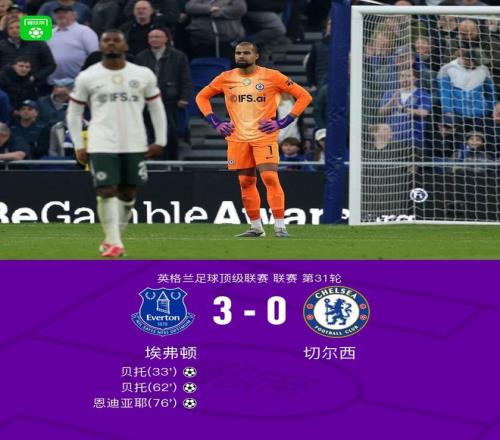 北京時間3月22日英格蘭足球頂級聯賽第31輪,埃弗頓主場對陣切爾西。上半場,加納直塞,貝托挑射破門。下半場,貝托再次破門,上演梅開二度,隨后貝托助攻,恩迪亞耶兜射死角,鎖定勝局。最終比分埃弗頓 3-0 切爾西。