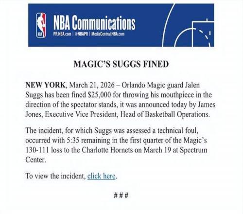 NBA官方還表示,魔術隊后衛薩格斯因朝著觀眾席扔牙套被罰款25000美元。