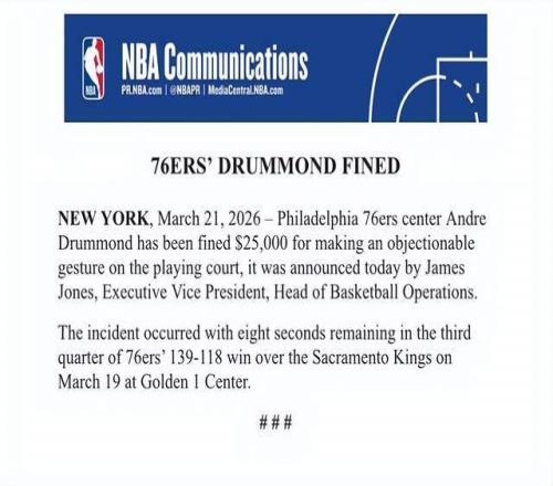 NBA官方表示,76人隊中鋒德拉蒙德因在場上做出不雅手勢,被罰款25000美元。NBA籃球運營執行副總裁詹姆斯-瓊斯公布了這一處罰決定。該事件發生在周五76人隊客場以139比118戰勝國王隊的比賽中,第三節還剩8秒時。