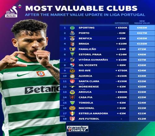 葡超俱樂部身價排名: